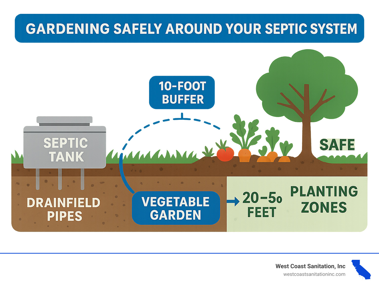 Experts recommend keeping vegetable gardens at least 10 feet away from the septic field to avoid contamination and system disruption.