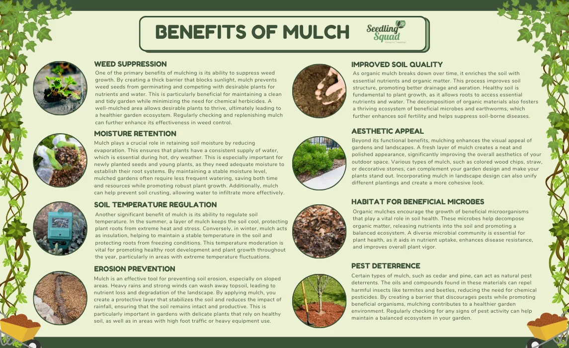 - Temperature Regulation: Keeps soil cooler in summer and warmer in winter.