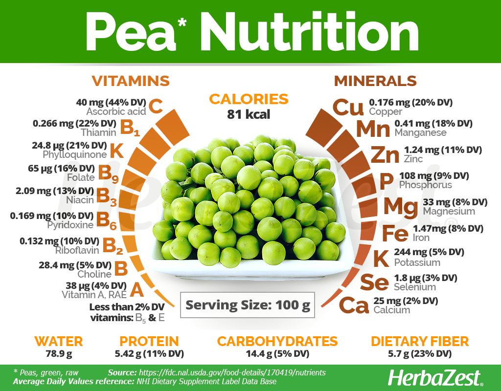 - Garden peas provide protein along with fiber, vitamins (such as vitamin C and K), minerals (iron, magnesium), and antioxidants.