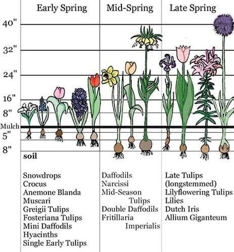 • Bulbs like tulips or daffodils should be planted at 6 to 8 inches deep.