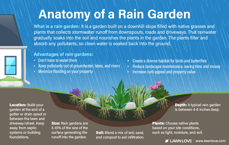 The depression in the rain garden holds the water temporarily. This slows down the runoff, reducing the risk of flooding and erosion downstream.
