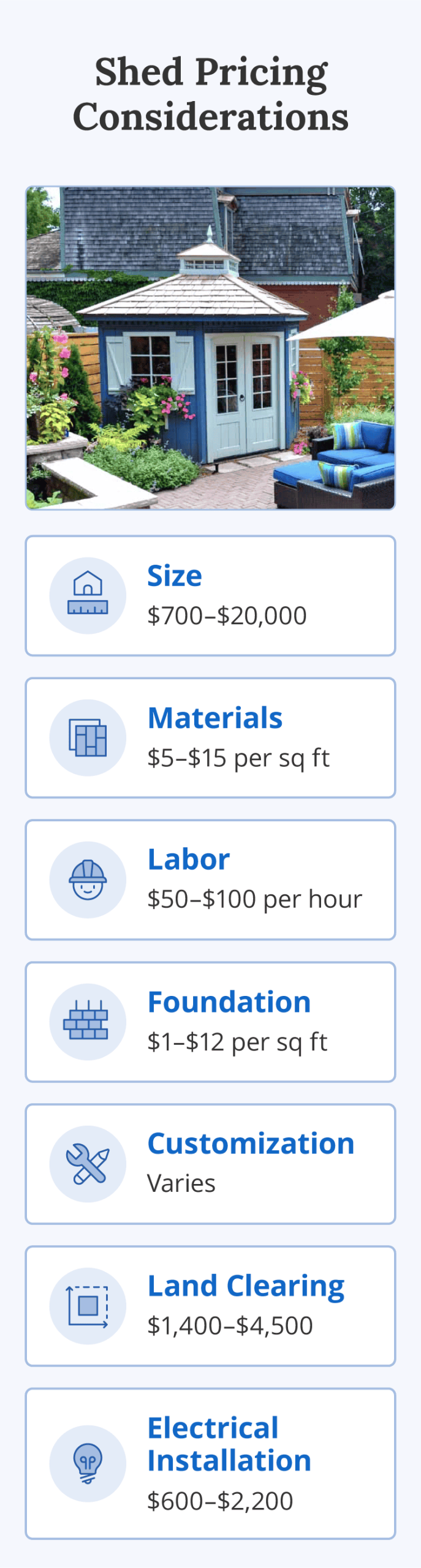 Don’t forget to budget for site preparation and assembly, which can sometimes equal or exceed the shed’s purchase price.