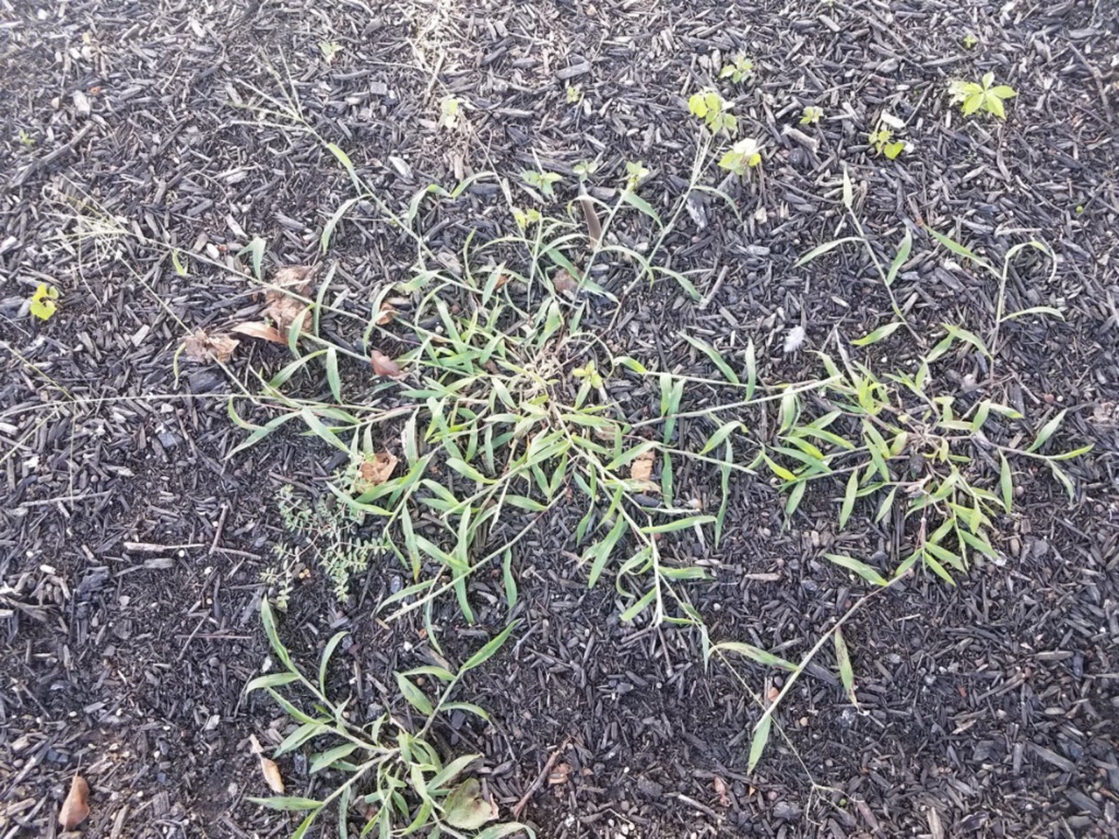 Crabgrass (Digitaria spp.) is a fast-growing, invasive weed that thrives in warm, sunny areas with disturbed soil. It spreads via seeds and creeping stems called stolons, allowing it to quickly colonize flower beds and lawns.