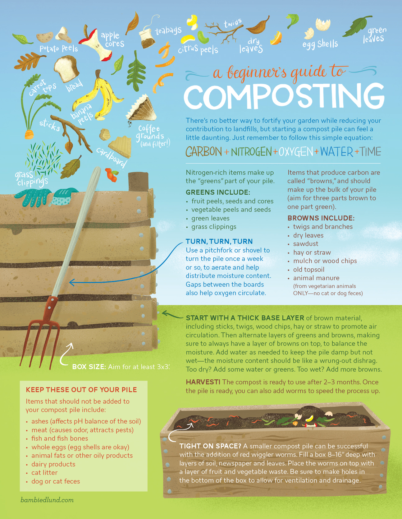 - If the pile smells bad, add more browns and turn it to reduce anaerobic bacteria.