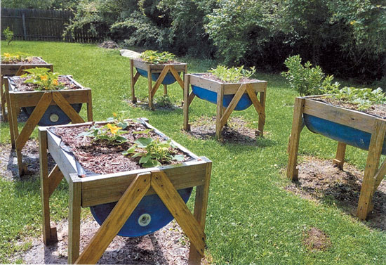 Raised beds made from plastic barrels support a variety of plants, especially: