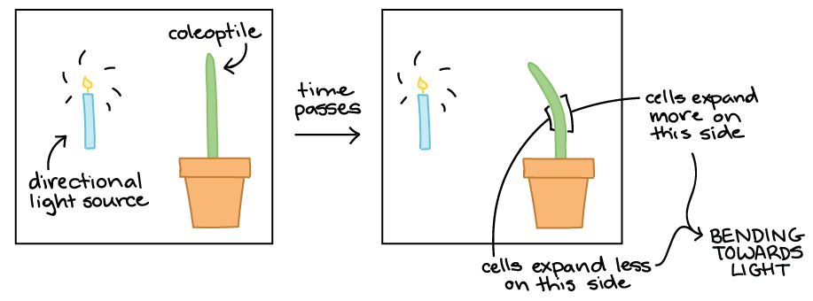 - The hormone auxin redistributes to the shaded side, causing cells to elongate and the plant to bend.