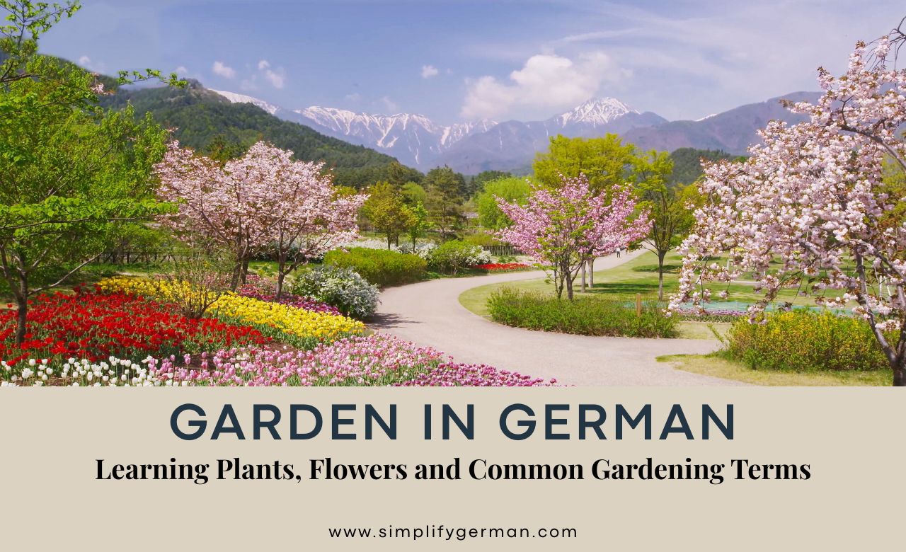 - Various types of gardens have specific German terms, such as Gemüsegarten (vegetable garden) and Blumengarten (flower garden).