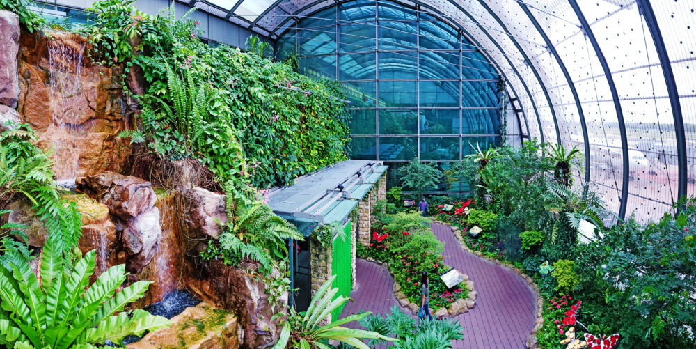 The Butterfly Garden at Changi Airport is Singapore’s first butterfly garden in an airport setting and spans approximately 1,000 square feet. It recreates a tropical rainforest environment, featuring: